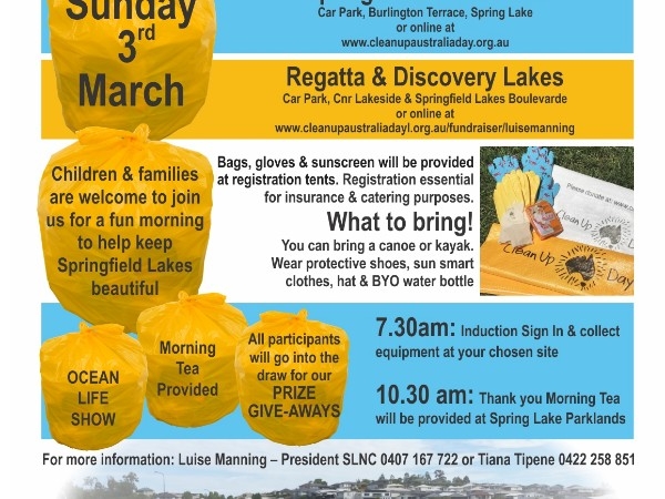 We hope that some people with Kayaks can help clean up Discovery Lake, if we all do a little a lot can be achieved. If you have a large pool net it would certainly help to fish out the bottles and cans that are floating near the edge of Spring Lake. MacDonalds the National sponsor for Clean Up Australia Day has offered some free ice creams to the kids that come along to help.